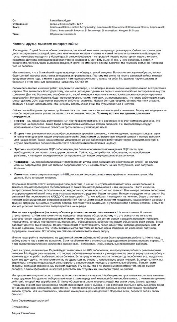 В Сети появилось письмо главы BI Group Айдына Рахимбаева, где он рассказал о мерах борьбы с коронавирусом, передает Tengrinews.kz.