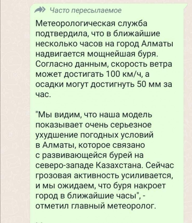 В мессенджерах распространилась рассылка якобы от казахстанских метеорологов, предупреждающая о "мощнейшей" буре, надвигающейся на Алматы. В рассылке указано, что сила ветра может достигнуть 100 километров в час, а осадки - 50 миллиметров за час. Авторы рассылки указывают, что ветер и ливни могут привести к повреждению зданий и инфраструктуры, а жителей города призывают сидеть дома.
