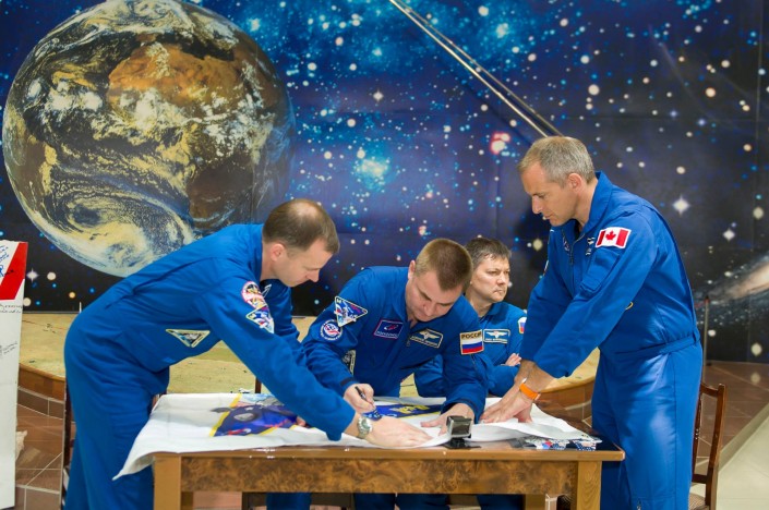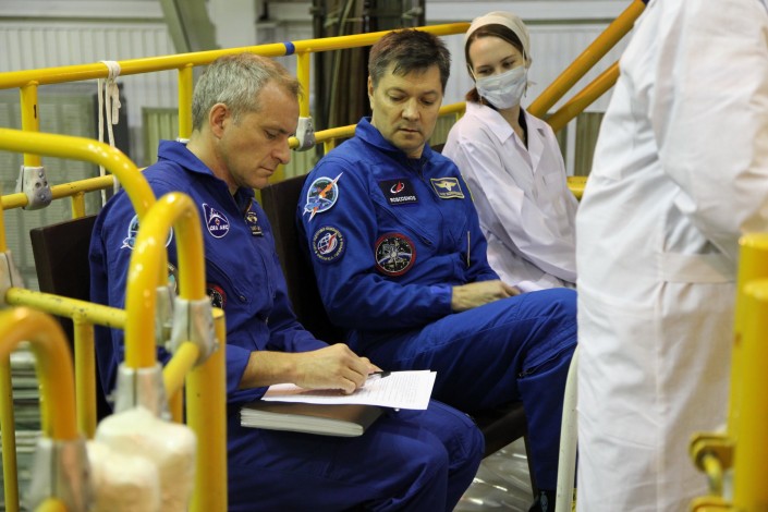 Основной и дублирующий экипажи провели "вторую примерку" - контрольный осмотр корабля в стартовой конфигурации. Космонавты и астронавты заняли места в корабле, в тестовом режиме проверили работоспособность различных систем, включая систему связи, и уточнили расположение грузов.