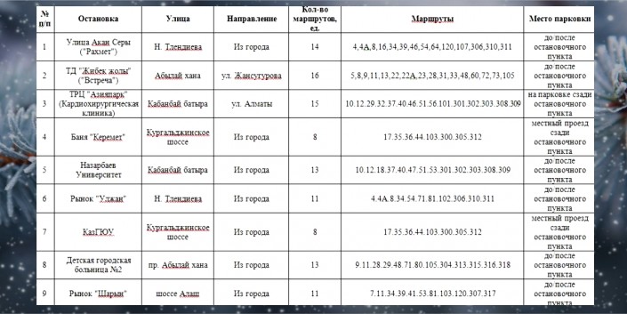 В связи с морозами в Астане районы определенных остановочных пунктов оснастят дежурными автобусами для того, чтобы люди смогли согреться, ожидая свой автобус. Дежурные автобусы будут ожидать 25 декабря на следующих остановках: