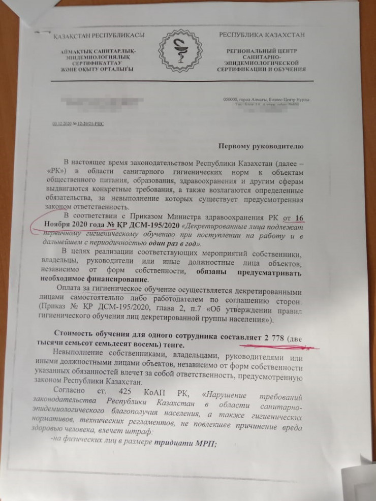 В качестве доказательства учителя показали корреспонденту сам документ. В нем говорится, что согласно приказу министра здравоохранения от 16 ноября 2020 года "Декретированные лица подлежат первичному гигиеническому обучению при поступлении на работу и в дальнейшем периодичностью один раз в год".