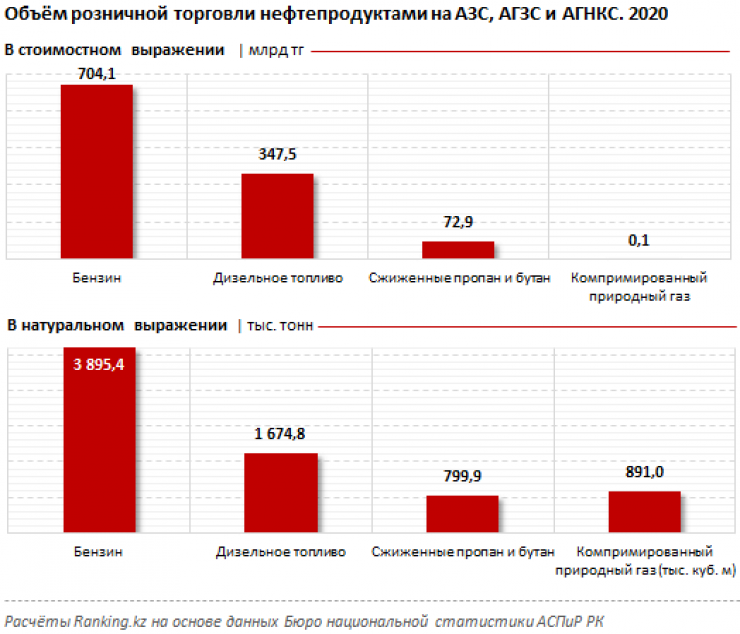 Почти две трети объемов розничной торговли нефтепродуктами на АЗС, АГЗС и АГНКС в стоимостном выражении пришлись на бензин: 704,1 миллиарда тенге, что в натуральном выражении составило почти 3,9 миллиона тонн.