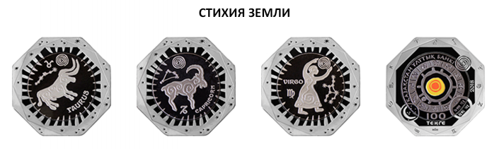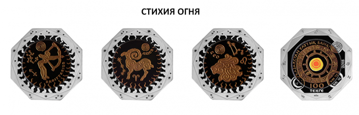 Монеты изготовлены в 12 видах, соответствующих каждому знаку зодиака - "Овен", "Лев", "Стрелец", "Телец", "Дева", "Козерог", "Водолей", "Близнецы", "Весы", "Рыбы", "Рак" и "Скорпион".  Дизайн монет выполнен в стилистике наскальной живописи. Каждый цвет танталовой вставки на монете соответствует цвету стихии. Монеты изготовлены из серебра и тантала с применением технологии изменения цвета.
