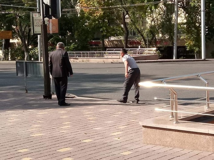 Фотографии произошедшего разместили пользователи Facebook. На фото видно, как на пересечении проспекта Абая и улицы Абылай хана прямо на тротуаре выставили джипы.