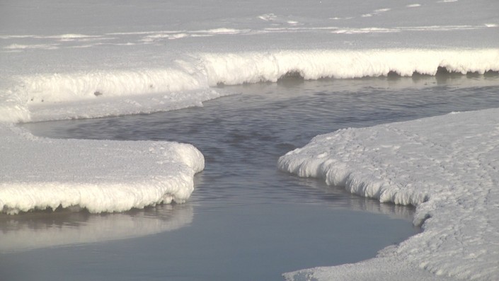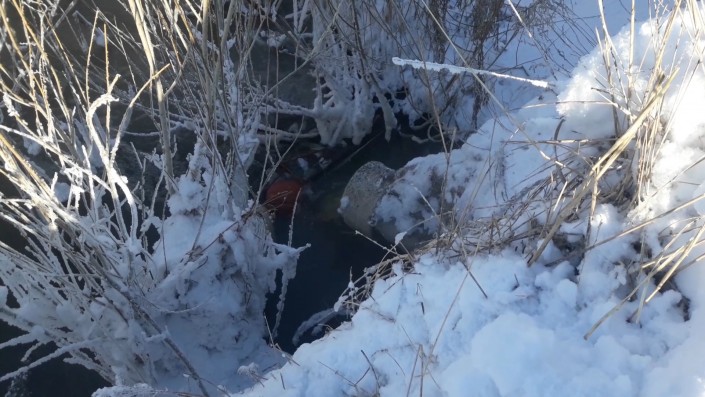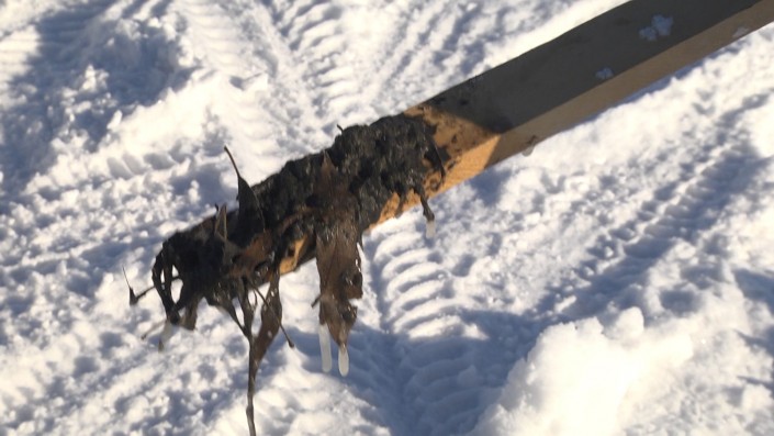 Тревогу забил рыбак с 50-летним стажем Игорь Евдокимов. Сначала о черной речке ему сообщили другие рыбаки, а после он и сам нашел зловонный источник. Темная вонючая жижа пробила незамерзающее русло и втекает в озеро со скоростью примерно кубометр в секунду. В русле уже скопилась черная грязь.