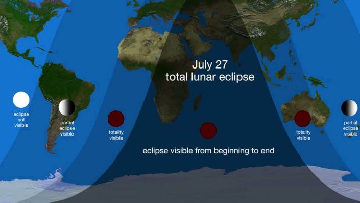 Судя по карте, жители Казахстана смогут увидеть редкое небесное явление от начала до конца. Лунное затмение будет видно на большей части земли 27 июля 2018 года. По крайней мере, часть затмения будет видна на всех основных территориях земли, кроме Северной и Центральной Америки, с полной видимостью на ближнем Востоке, в Индии, в частях Центральной Азии, а также Восточной и Южной Африки. Затмение начнется в 00.24 (по времени Астаны), с полным лунным затмением с 01.30 до 03.13 и закончится в 04.20.