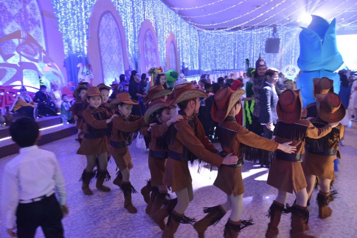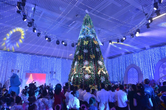 В праздновании приняли участие аким Астаны Асет Исекешев и министр образования и науки Ерлан Сагадиев. Они поприветствовали детей и поводили с ними хороводы. Тема праздника в этом году - "Новогодние огни EXPO".