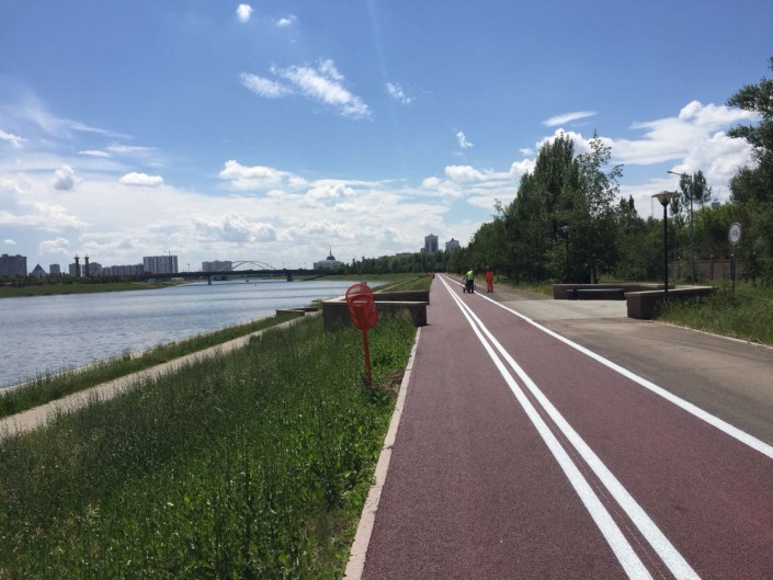К 20-летию Астаны в столице с участием ряда областей было построено 56 километров велодорожек. Строительство велосипедной дорожки от берега реки Есиль до моста на улице Кунаева осуществлено с участием Туркестанской области. Велодорожка проходит по левому берегу реки Есиль, через городок ЭКСПО и соединяется с велодорожками в районе "зеленого пояса" от Ильинки и лыжными и роликовыми дорожками.