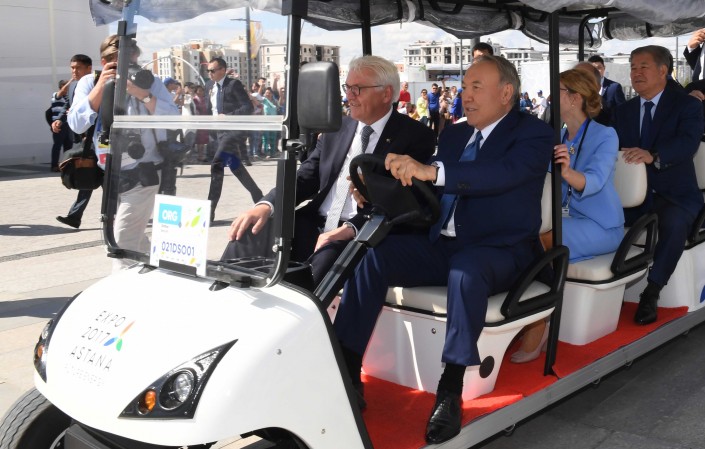 "Здесь лидеры двух стран ознакомились с интерактивными экспозициями, посвященными культуре и истории Казахстана, а также поднялись на восьмой этаж павильона, где расположена экспозиция "Астана будущего". По окончании экскурсии президент ФРГ сделал запись в книге почетных гостей выставки.