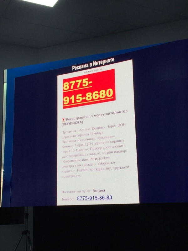 "Читайте: "Прописка в Астане, дешево, через ЦОН. Адресная справка 15 минут, прописка постоянная, временная, законно, через ЦОН, адресная справка, через 10-15 минут. Помогу восстановить удостоверение личности, загранпаспорт даже сделаю". Значит, МИД продает паспорт. "Регистрация иностранных граждан..." - вот, называют, какие страны. Что за безобразие?" - зачитал одно из таких объявлений Нурсултан Назарбаев.