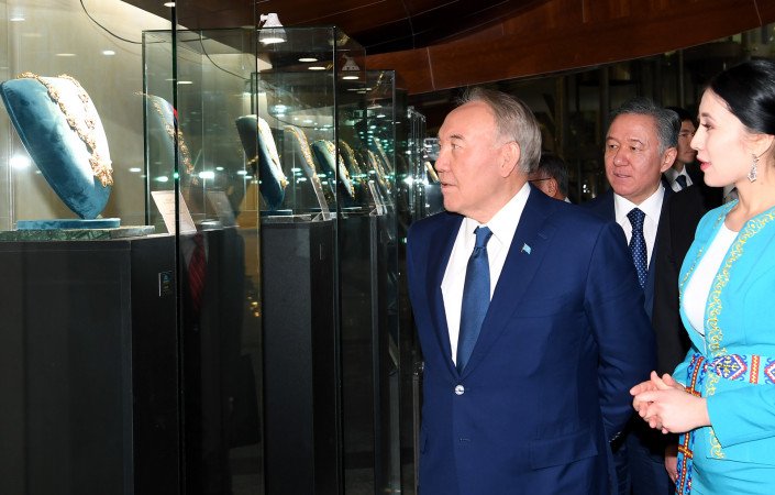 Перед началом концерта Нурсултан Назарбаев посетил выставку "Исторический выбор", экспозиция которой собрана на основе комплекса архивных материалов и уникальных предметов музейного собрания Библиотеки Елбасы.