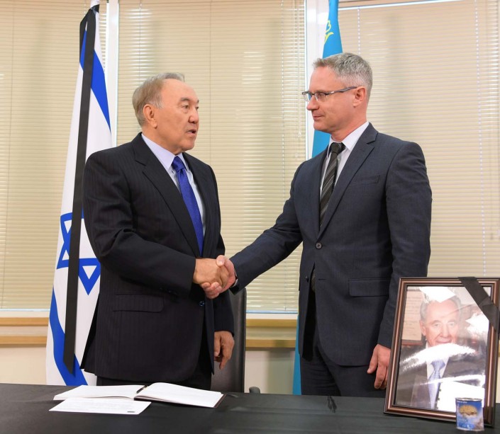 "Я прибыл в посольство Израиля, чтобы еще раз выразить мои глубокие соболезнования в связи с кончиной великого сына израильского народа Шимона Переса", - отметил Президент Казахстана.