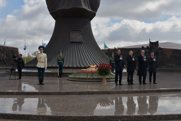 В Астане к монументу "Отан қорғ­аушылар" возложили цветы в честь Дня Победы, передает корреспондент Tengrinews.kz.