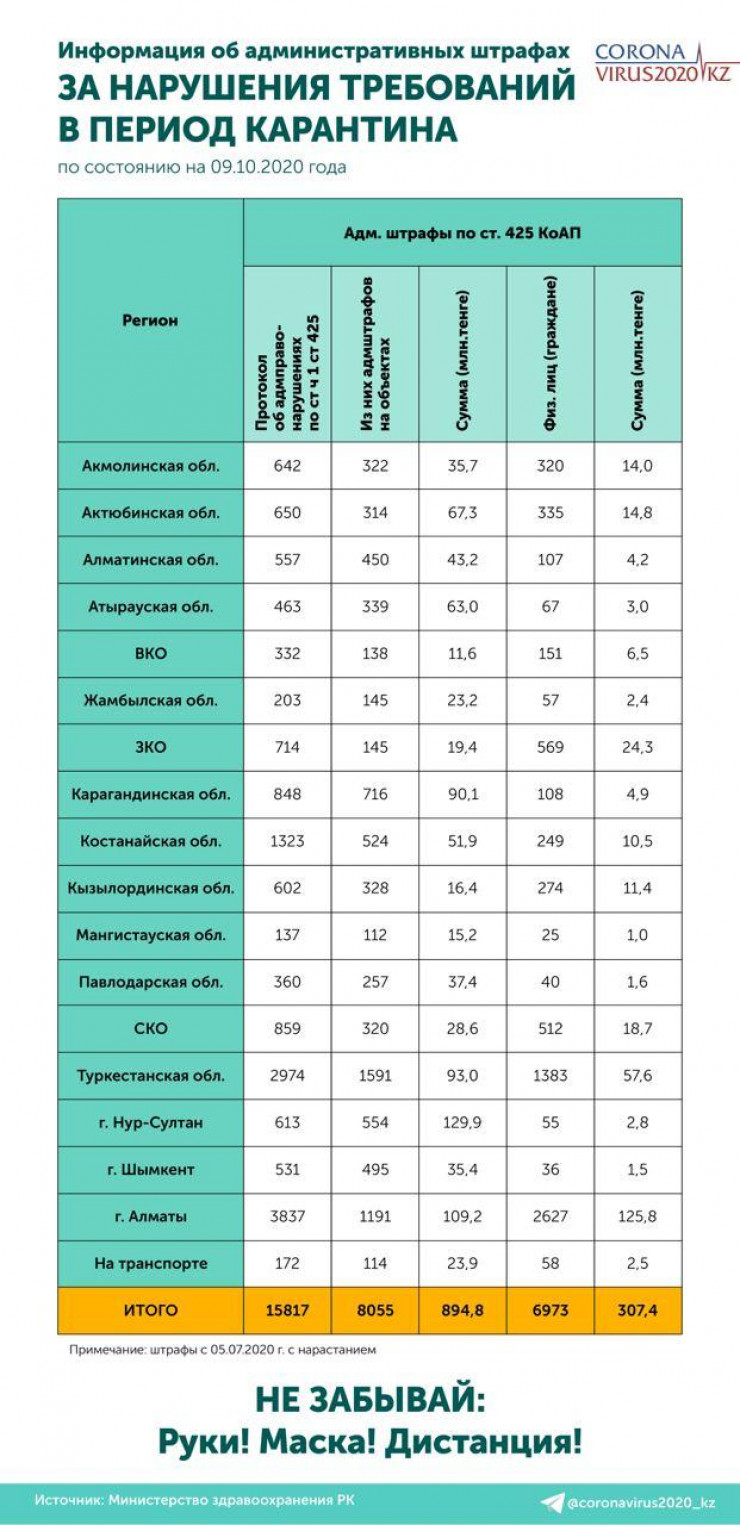 Статистику об административных штрафах за нарушение санитарно-эпидемиологических требований, выписанных с 5 июля 2020 года, опубликовали в Telegram-канале Coronavirus2020, передает Tengrinews.kz.