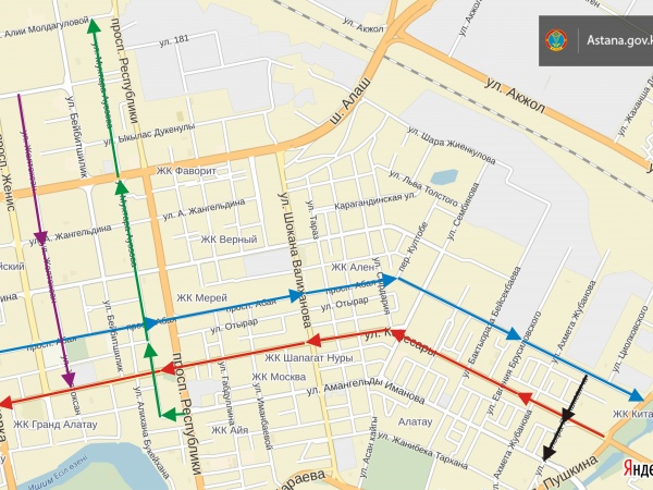 Согласно утвержденному плану, одностороннее движение появится сначала на улице Ауэзова (от проспекта Республики до улицы Алии Молдагуловой). Протяженность данного участка - 2,9 километра. И на улице Желтоксан (от улицы Московской до улицы Кенесары). Протяженность данного участка - 2 километра.