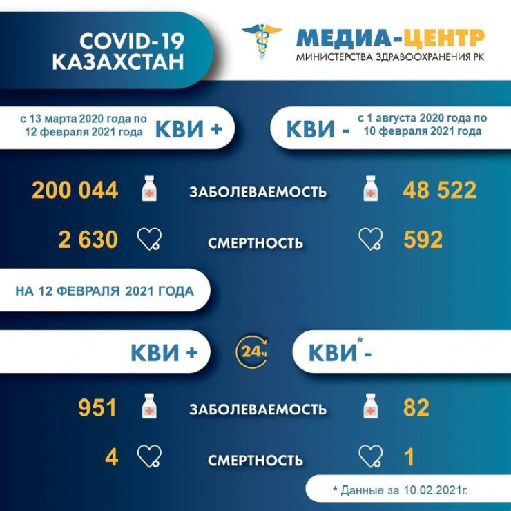 За сутки выявлено 82 заболевших пневмонией с признаками коронавируса и отрицательным ПЦР-анализом. На 12 февраля лечение от КВИ продолжают получать 24 847 человек (15 440 КВИ+ и 9 407 КВИ-), передает Tengrinews.kz со ссылкой на пресс-службу Министерства здравоохранения.