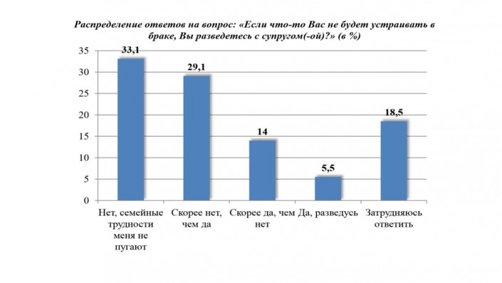 Большинство опрошенных не готовы разводиться в случае возникновения каких-либо трудностей (62,2 процента), в том числе более трети опрошенных ответили однозначно "нет, так как семейные трудности не могут напугать и стать причиной развода".