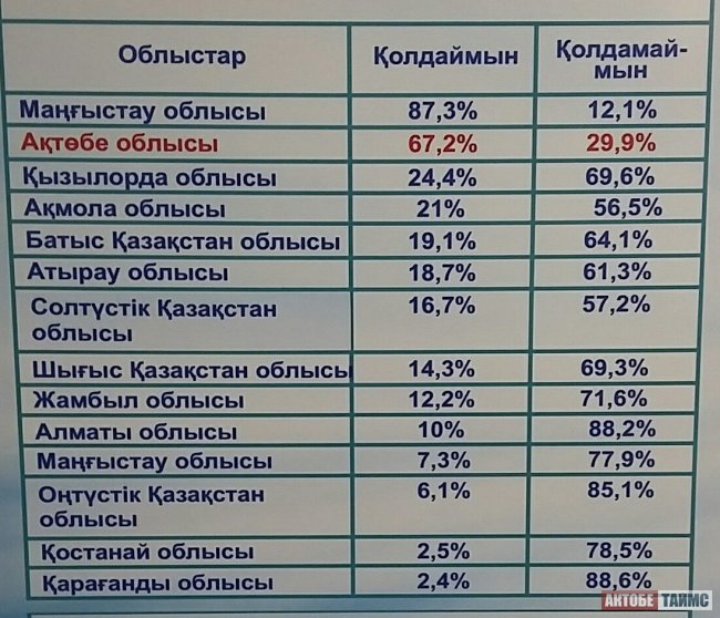 Издание публикует результаты исследования, проведенного независимыми экспертами. Согласно нему, в Акмолинской области латинизацию поддерживает 21 процент жителей, в Южно-Казахстанской области только шесть процентов, в Костанайской области 2,5 процента, в Карагандинской всего два процента.