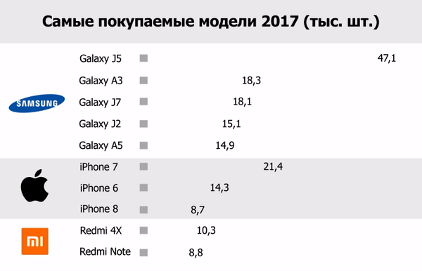 Среди моделей безусловный лидер - бюджетный Samsung Galaxy J5. За год клиенты магазина купили 47 тысяч смартфонов этой модели - в три раза больше, чем годом ранее. Если в 2016 году каждый десятый покупатель выбирал Samsung Galaxy J5, то в 2017 - каждый шестой.
