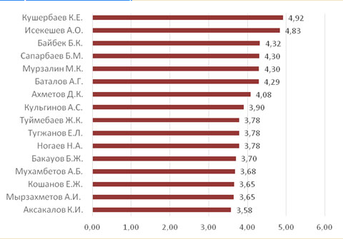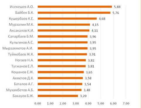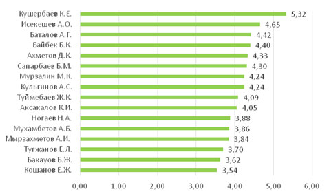 Согласно полученным данным, эксперты в основном оценили работу акимов на среднем уровне. Оценку выше пяти баллов (первое место; 5,07 балла по семибалльной шкале) получил только аким Астаны Асет Исекешев.