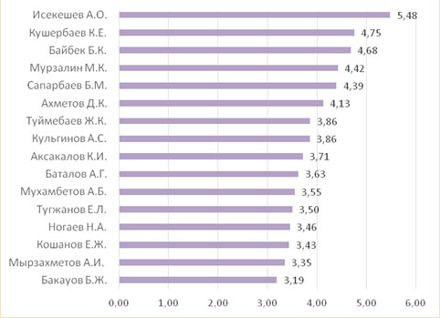 Диаграмма 5. Рейтинг акимов с точки зрения перспективности (первое полугодие 2018 года; в баллах)