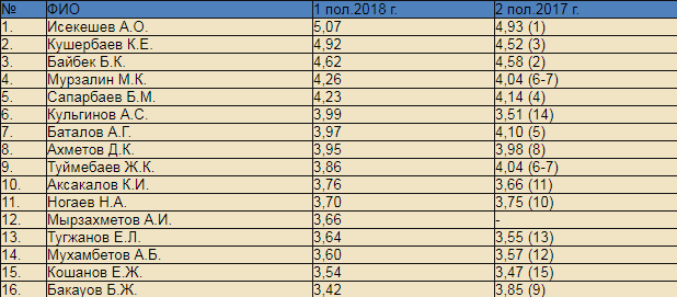 Таблица 1. Рейтинг акимов регионов по оценке эффективности деятельности (первое полугодие 2018 года)