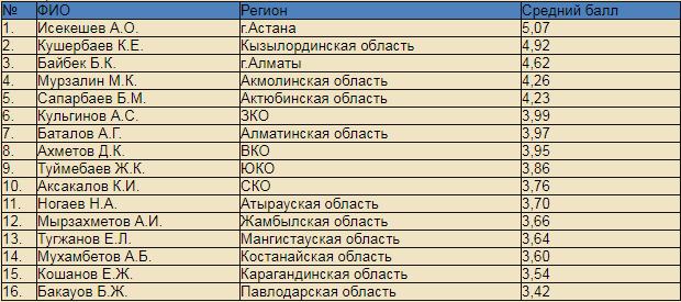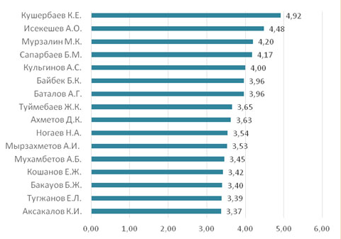 В целом только пять региональных акимов получили общую оценку выше четырех баллов: то есть, помимо Исекешева, Кушербаева, Байбека, наиболее эффективными признаны также аким Акмолинской области Малик Мурзалин (четвертое место; 4,26 балла) и аким Актюбинской области Бердибек Сапарбаев (пятое место; 4,23 балла).