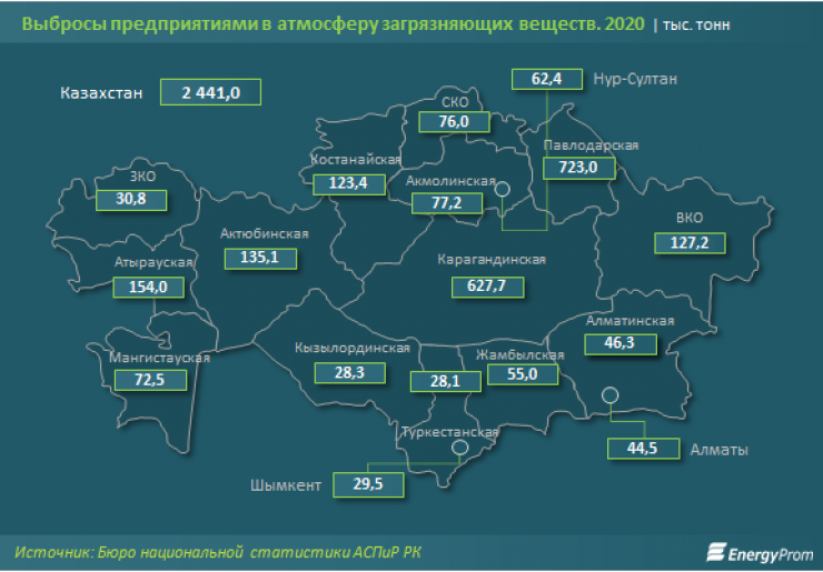 В разрезе регионов больше всего выбросов пришлось на предприятия Павлодарской области: 723 тысячи тонн, плюс 0,2 процента. В тройке регионов с худшими показателями оказались также промышленные Карагандинская и Атырауская области: 627,7 тысячи и 154 тысячи тонн соответственно. На эти три области пришлось 61,6 процента всего объема выбросов.