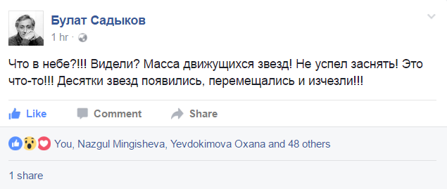 Стоит подчеркнуть, что, комментируя видеозапись, эксперт по фейерверкам Султан Рыспаев заявил, что это не является пиротехническим эффектом, поскольку огни в небе мерцали и горели слишком долго. Заведующий лабораторией физики Луны и планет Института астрофизики имени Фесенкова Виктор Тейфель заявил, что это не НЛО и не метеориты. "Если бы это были метеорные частицы, они бы летели все синхронно, с одной скоростью. Скорее всего, это какой-то оптический эффект, связанный с тем, что на земле делается. Вообще же, в многочисленных случаях сообщений о подобных явлениях оказывается недостаточно информации для уверенного объяснения их природы", - сказал он.