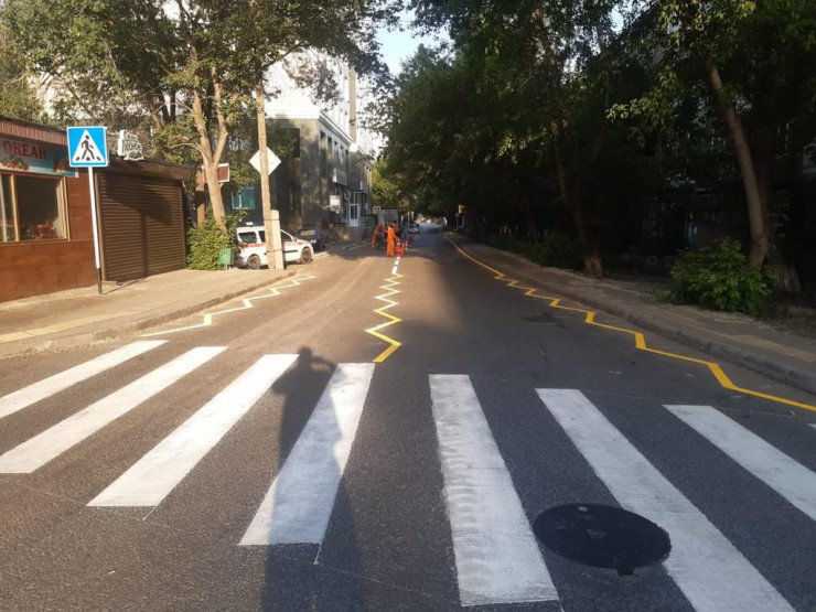 "В пилотном варианте применены зигзагообразные линии дорожной разметки желтого цвета по улице Отырар, 8/2 перед пешеходными переходами. Данная разметка позволяет сконцентрировать внимание водителей на пешеходных переходах, а также позволяет исключить остановку и стоянку транспортных средств", - пояснили в пресс-службе департамента.