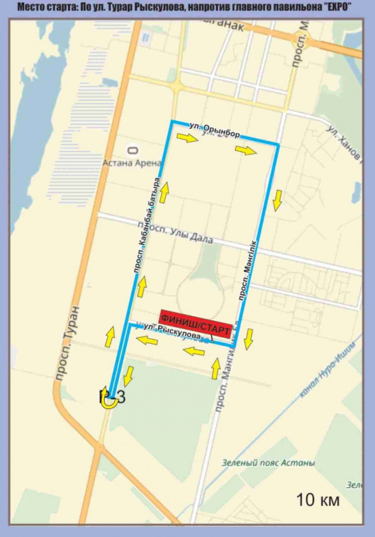 Дистанция на 10 километров также стартует с территории EXPO, далее протянется на улицы Рыскулова – Кабанбай батыра – разворот в районе ЖК "Будапешт" - Кабанбай батыра – Орынбор – Мангилик Ел – Рыскулова – и финиш на территории EXPO.