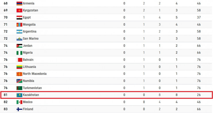 Таким образом, казахстанские спортсмены завоевали в Токио восемь медалей - все бронзы. На данный момент Казахстан находится на 81-м месте в медальном зачете.