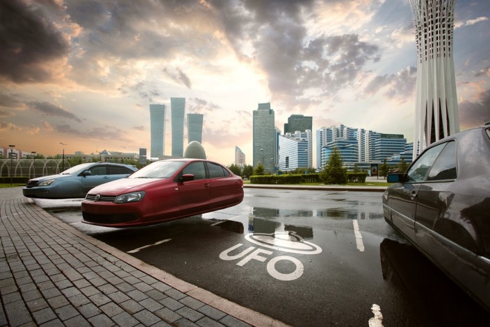 Астана будущего по версии Игоря Югая. На парковке возле "Байтерека" - летающие машины. Отдельные места - для НЛО.