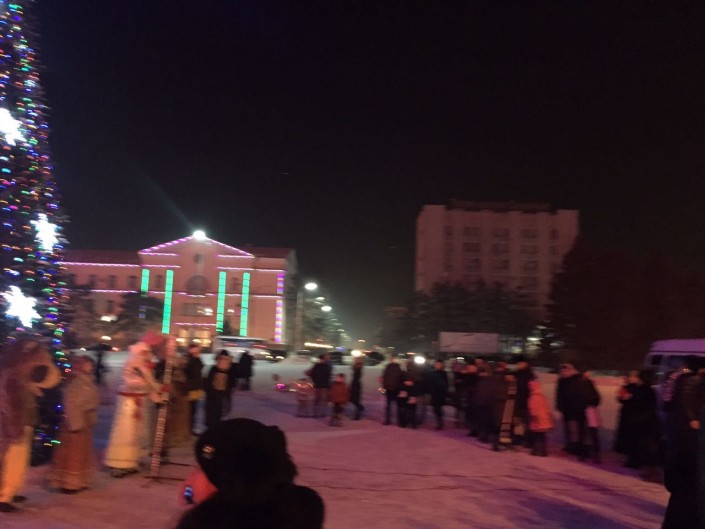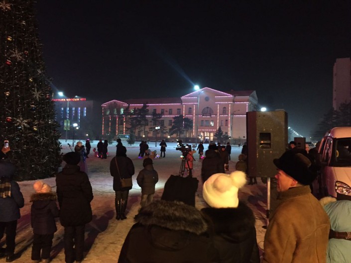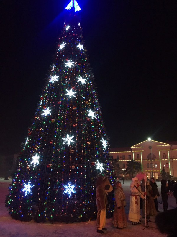 На центральной площади Петропавловска зажгли огни на 18-метровой елке. Она украшена игрушками и 60 светодиодными гирляндами. В церемонии принял участие аким Северо-Казахстанской области Ерик Султанов. Аким области вместе с детьми нажал на символическую кнопку, и чудо свершилось. Елка замигала разноцветными гирляндами. Все это сопровождали взрывы фейерверков и хлопушек с конфетти.