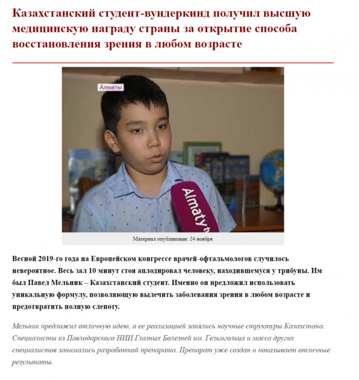 Чаще всего Павел Мельник фигурирует как российский студент, однако иногда он "меняет гражданство" и становится казахстанским. В версии фейка для Казахстана сказано, что препарат на основе разработки молодого дарования создали в Павлодарском НИИ глазных болезней имени Гельмгольца. Такого учреждения в Павлодаре нет, на самом деле институт с этим названием расположен в Москве.