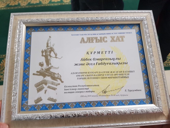 Благодарственно письмо родителям Надира Омаргазиева. Фото: Ботагоз Айтжанова