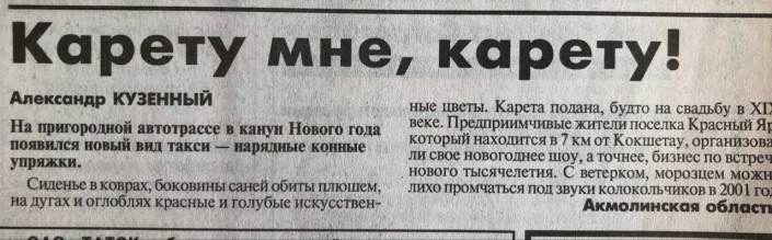 В Акмолинской области предприимчивые сельчане в преддверии нового тысячелетия организовали бизнес - катания на санях. На "новом виде такси", как сообщается в заметке, можно лихо умчаться в 2001 год.