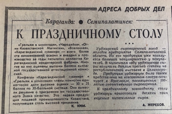 В этом же номере к праздничному столу предлагались конфеты "Грельяж в шоколаде", "Чародейка", "Огни казахстанской Магнитки", "Вселенная" и "Карагандинский сувенир" производства карагандинских кондитеров, а также урджарский сыр.