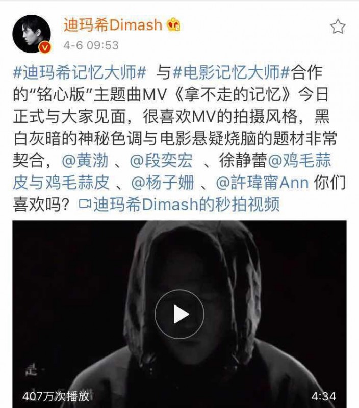 А вышедший днем позже клип к саундтреку в социальной сети Weibo на официальной странице Димаша Кудайбергена за день собрал более четырех миллионов просмотров. Об этом корреспонденту Tengrinews.kz рассказал PR-директор исполнителя Алпамыс Шаримов.