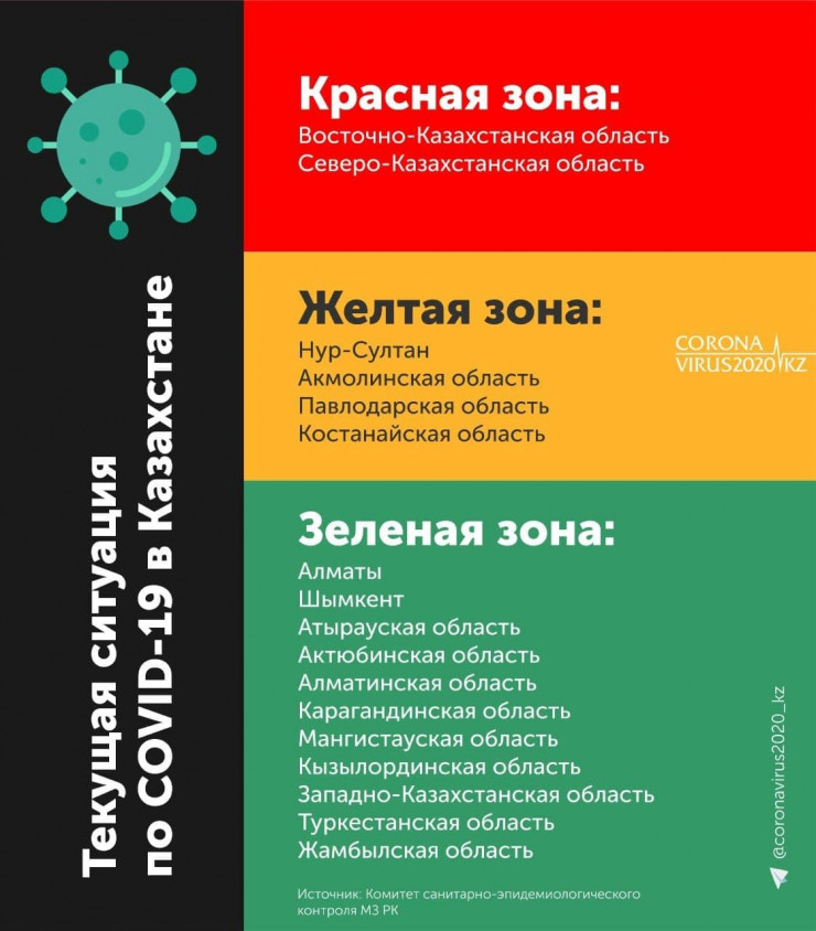 Ранее глава Комитета санэпидконтроля Минздрава Айжан Есмагамбетова сообщала, что в "красной" зоне находятся Восточно-Казахстанская и Северо-Казахстанская области. В "желтой" зоне - Нур-Султан, Алматы, Костанайская и Павлодарская области. Остальные регионы - в "зеленой" зоне. В своем выступлении Есмагамбетова не упомянула Акмолинскую область.