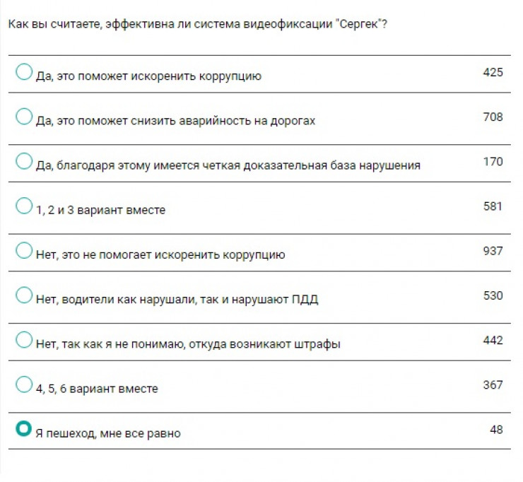 А вот об эффективности камер мнения разделились надвое. 45 процентов ответили, что камеры "Сергек" помогают искоренить коррупцию, снизить аварийность на дорогах и благодаря этому имеется четкая доказательная база нарушений. 54 процента посчитали "Сергек" неэффективными. Еще один процент проголосовавших приходится на пешеходов.