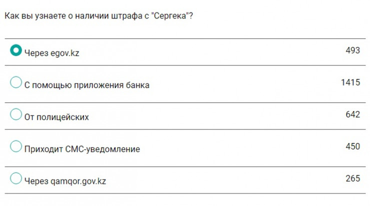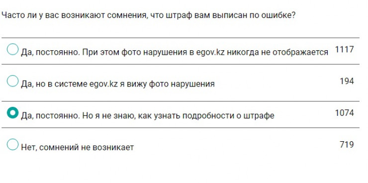 У многих часто возникает вопрос, не выписан ли штраф по ошибке. 36 процентов опрошенных ответили, что они постоянно сомневаются в "Сергеке", так как фото нарушения в egov.kz не отображается. Еще 35 процентов и вовсе не знают, как узнать подробности о штрафе.