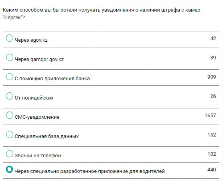 Автомобилисты среди желаемых способов получения уведомлений, выбрали СМС. Так ответили 49 процентов опрошенных. На втором месте - приложение банка. Менее популярными оказались порталы egov.kz, qamqor.gov.kz. А самое меньшее количество голосов набрал способ получения штрафов от полицейских.