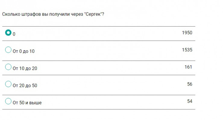 Остальная часть (58 процентов) не получает штрафы с "Сергека". Автомобилисты также рассказали, сколько всего штрафов они успели получить через "Сергек". До 10 нарушений собралось у 41 процента опрошенных, от 10 до 20 - у четырех процентов. Примерно одинаково (1,5 процента) набрали варианты ответа "От 20 до 50" и "От 50 и выше". Остальные штрафов не получали.