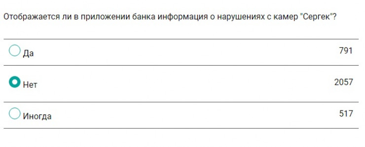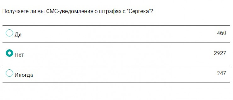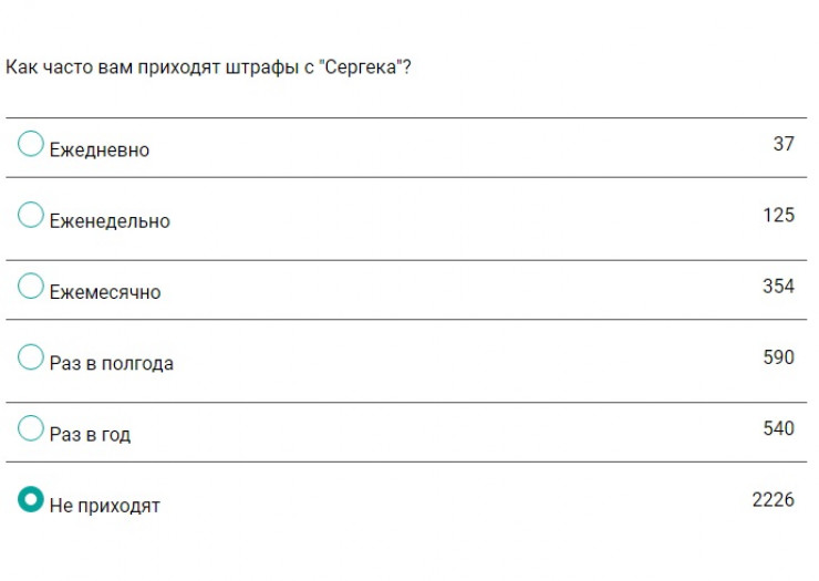 Также читатели ответили, насколько часто их штрафуют камеры "Сергек". Большинству извещения приходят раз полгода (15 процентов) или раз в год (14 процентов). Варианты ответа "Еженедельно" либо "Ежемесячно" выбрали 12 процентов опрошенных. Нашлись и те, кому информация о нарушениях приходит каждый день (один процент).