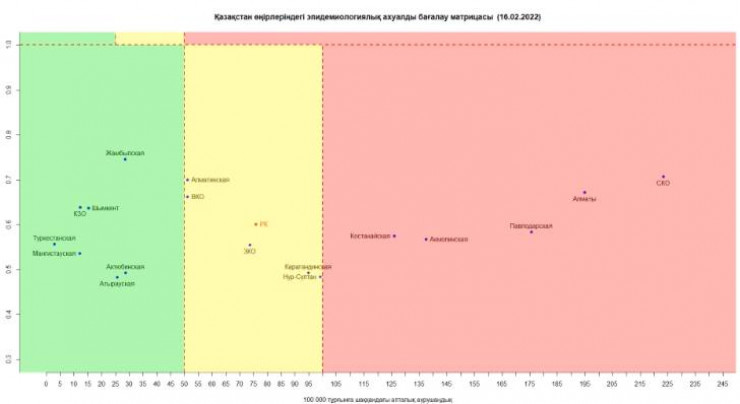 • в "красной" зоне находится Алматы, а также Акмолинская, Костанайская, Павлодарская и Северо-Казахстанская области;