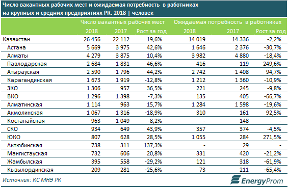 Также высока потребность в кадрах в Алматы (4,3 тысячи вакансий, на 10,4 процента больше, чем годом ранее) и Павлодарской области (2,7 тысячи вакансий - на 46,6 процента больше, чем год назад).