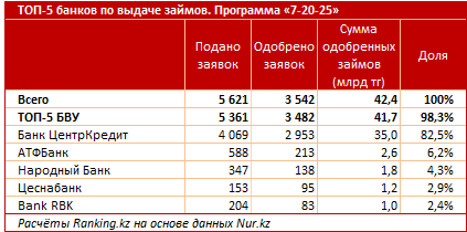 Из 28 БВУ только 8 участвуют в данной программе. Абсолютным лидером является Банк ЦентрКредит, который одобрил около 3 тысяч заявок из 4 тысяч поданных на общую сумму 35 миллиардов тенге (82,5 процента от всех займов).