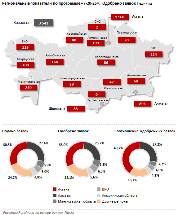 Наименьшая активность жителей зафиксирована в Туркестанской, Северо-Казахстанской и Павлодарской областях: в перечисленных регионах суммарное число заявителей составило 79 человек, из которых 30 получили одобрение займа.