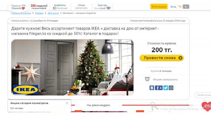 "В январе этого года мы купили купон через Chocolife.me на покупку мебели в Ikea через поставщика ТОО "Доставкин", - говорит жительница Алматы Дарига Джакупова. - До сих пор ни мебели, ни денег. В первую неделю, когда заказ должен был прийти, ТОО "Доставкин" "кормили" завтраками. Но ничего не привезли (...), - говорит она. - В последующие недели ТОО "Доставкин" уже трубки не брали и на некоторых сайтах их профайл был удален. В конце марта я обратилась в службу поддержки". По словам женщины, речь идет о десятках пострадавших. Затем поступила жалоба в Chocolife.me.